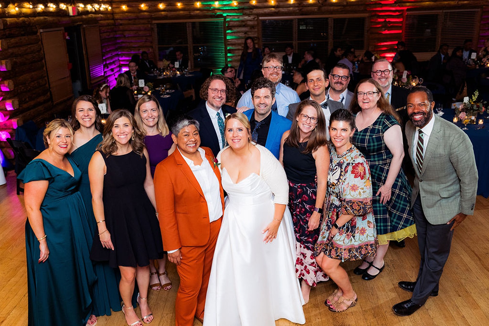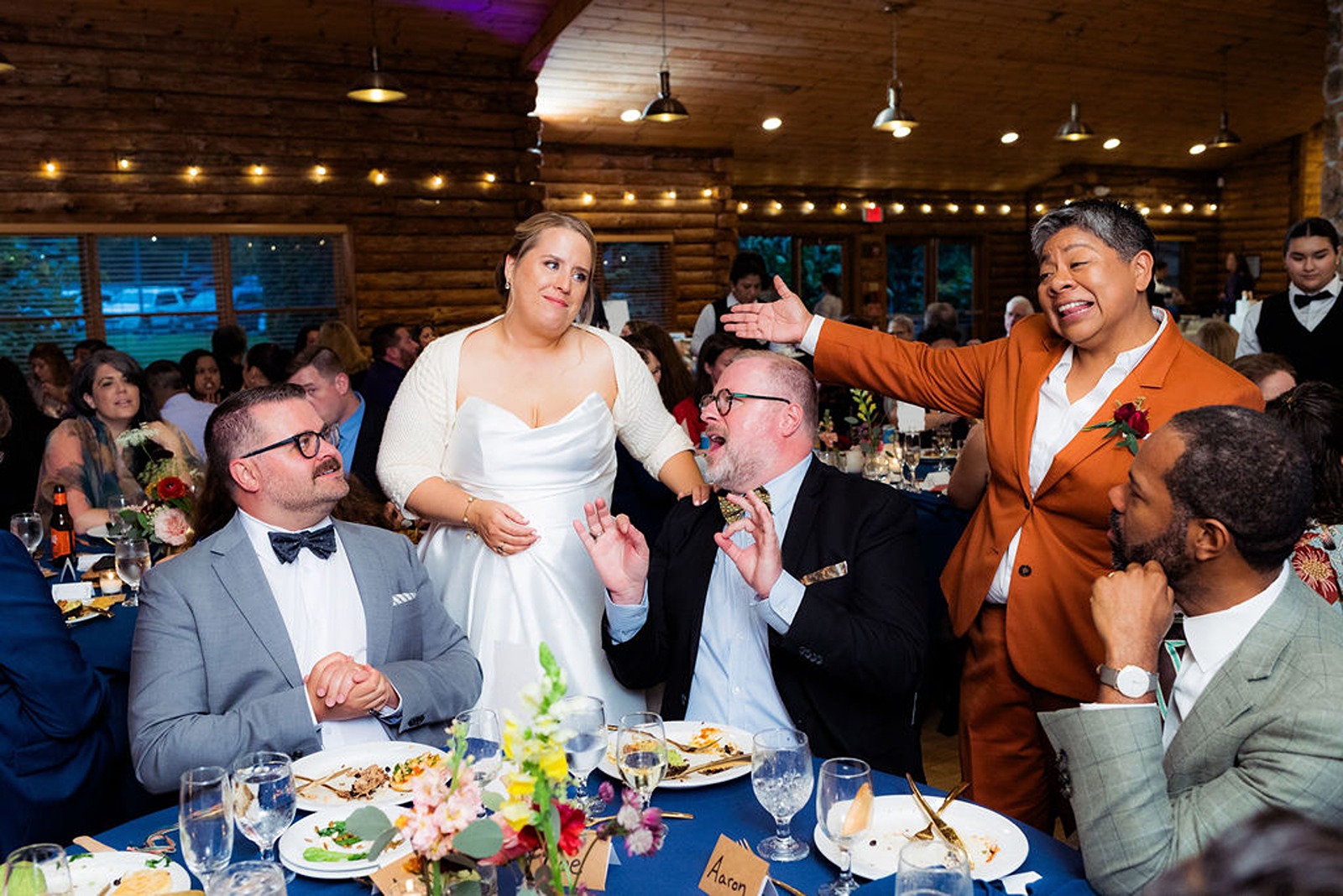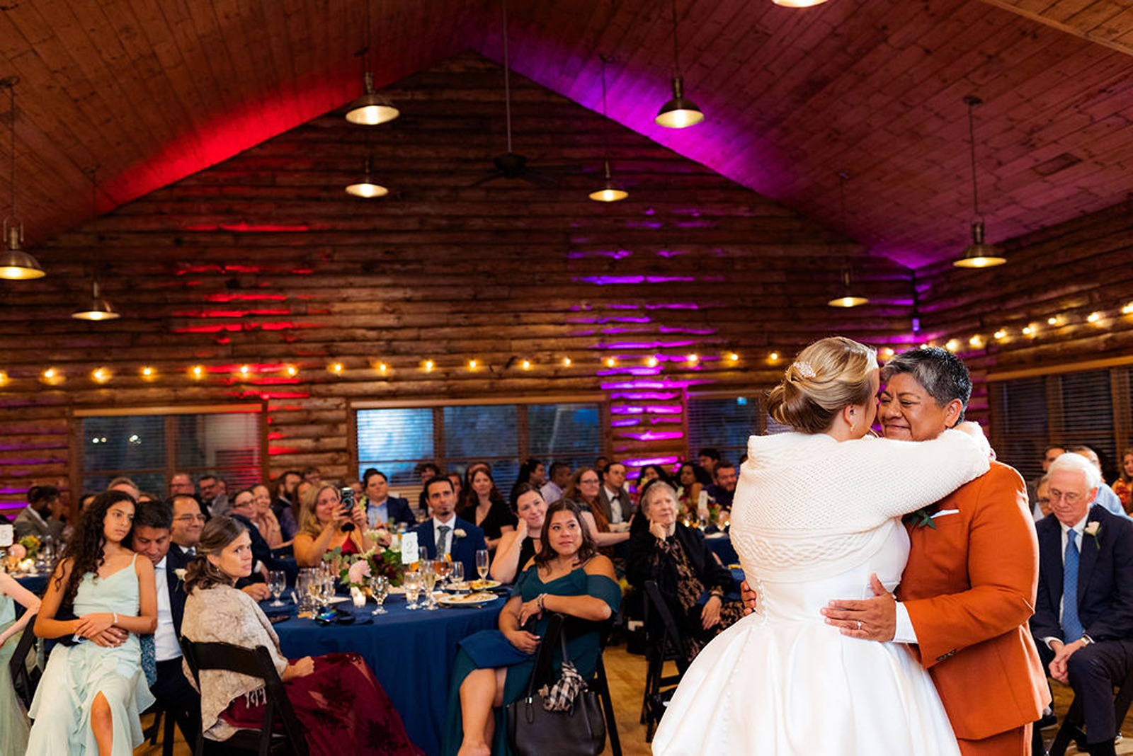 Every part of this wedding felt intentional. Sandra’s brother officiated the ceremony, blending faith and family with warmth and humor that had everyone smiling. The color palette drew from the rich tones of fall, rust, deep gold, and earthy greens, which looked stunning against the natural wood interior of the lodge.